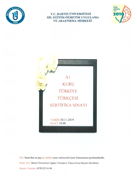 30 Kasım 2019 saat 10:00'da Yahya Kemal Beyatlı Derslikleri YK-105 Nolu derslikte Türkiye Türkçesi Sertifika Sınavı yapılacaktır.