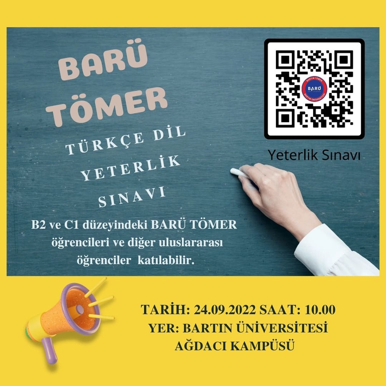 24 Eylül 2022 tarihinde Bartın Üniversitesine yerleşen uluslararası öğrenciler için Türkçe Dil Yeterlik Sınavı yapılacaktır. Saat 10.00'da gerçekleştirilmesi planlanan sınava Bartın TÖMER B2-C1 düzeyi öğrencileri de başvuru yapabilecektir.Sınava girecek öğrencilere başarılar diliyoruz.